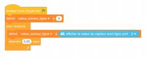 « Etat du suiveur de ligne sur le "Port2" » et Suiveur de ligne "Port 2 coté Gauche ( ou droit ) est Noir ( ou Blanc ) Ou " distance mesurée par ..." en fonction de la version du programme Mblock