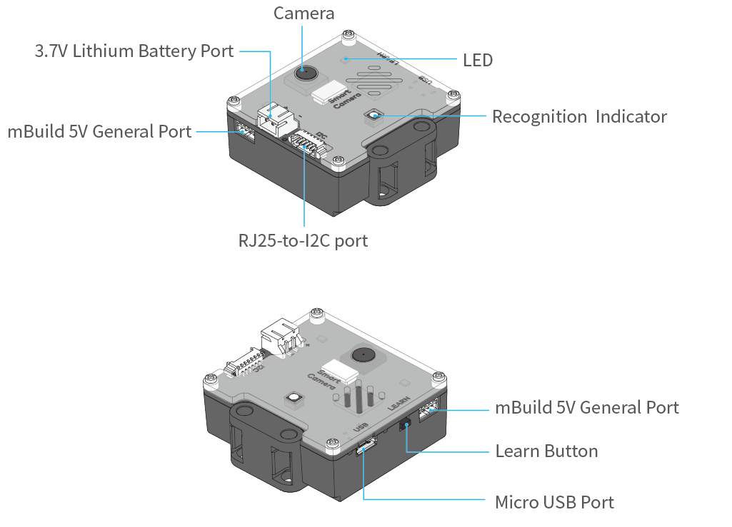 Note: It is recommended to power the smart camera through the mBuild power module. Power only through the USB port may affect the proper use of the block.