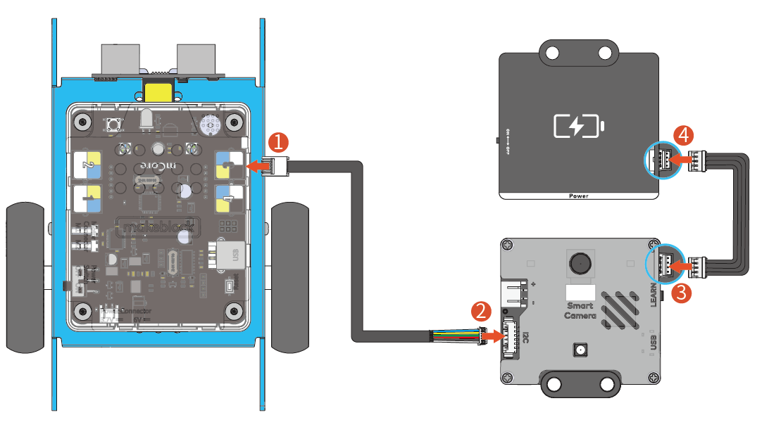 After connecting the smart camera to mBot, you can power it with a 3.7V lithium battery or the mBuild power module.